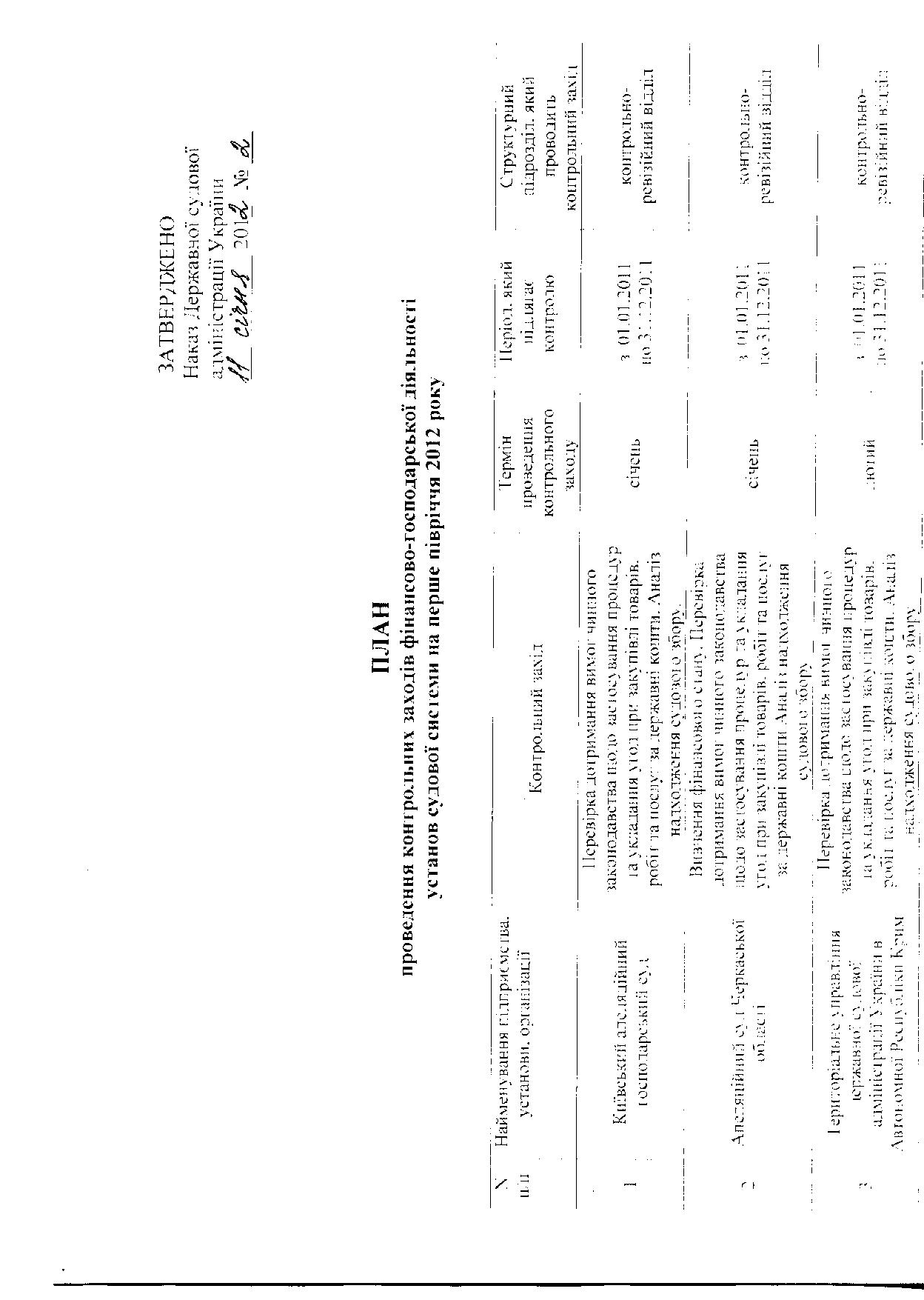 Наказ Державної судової адміністрації України від 11 січня 2012 року № 2 "Про затвердження плану проведення контрольних заходів фінансово-господарської діяльності установ судової системи"