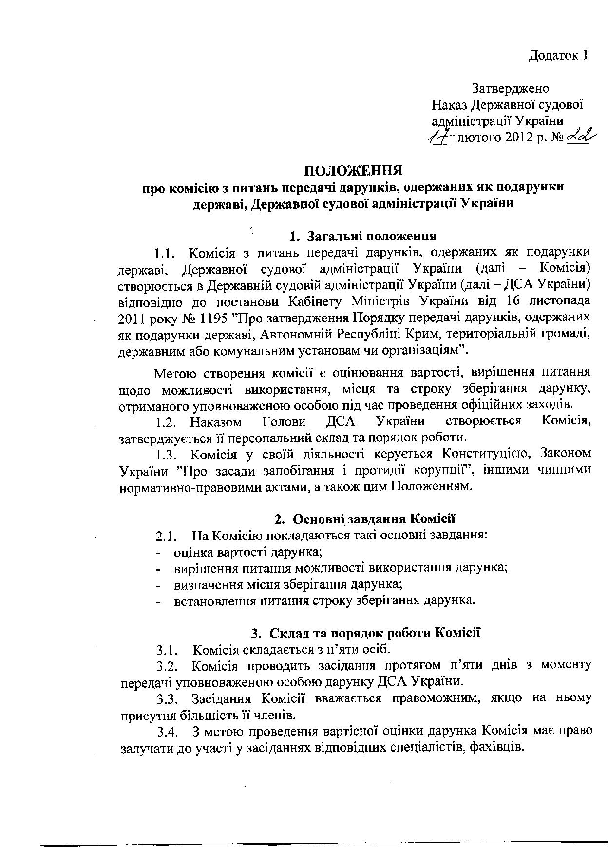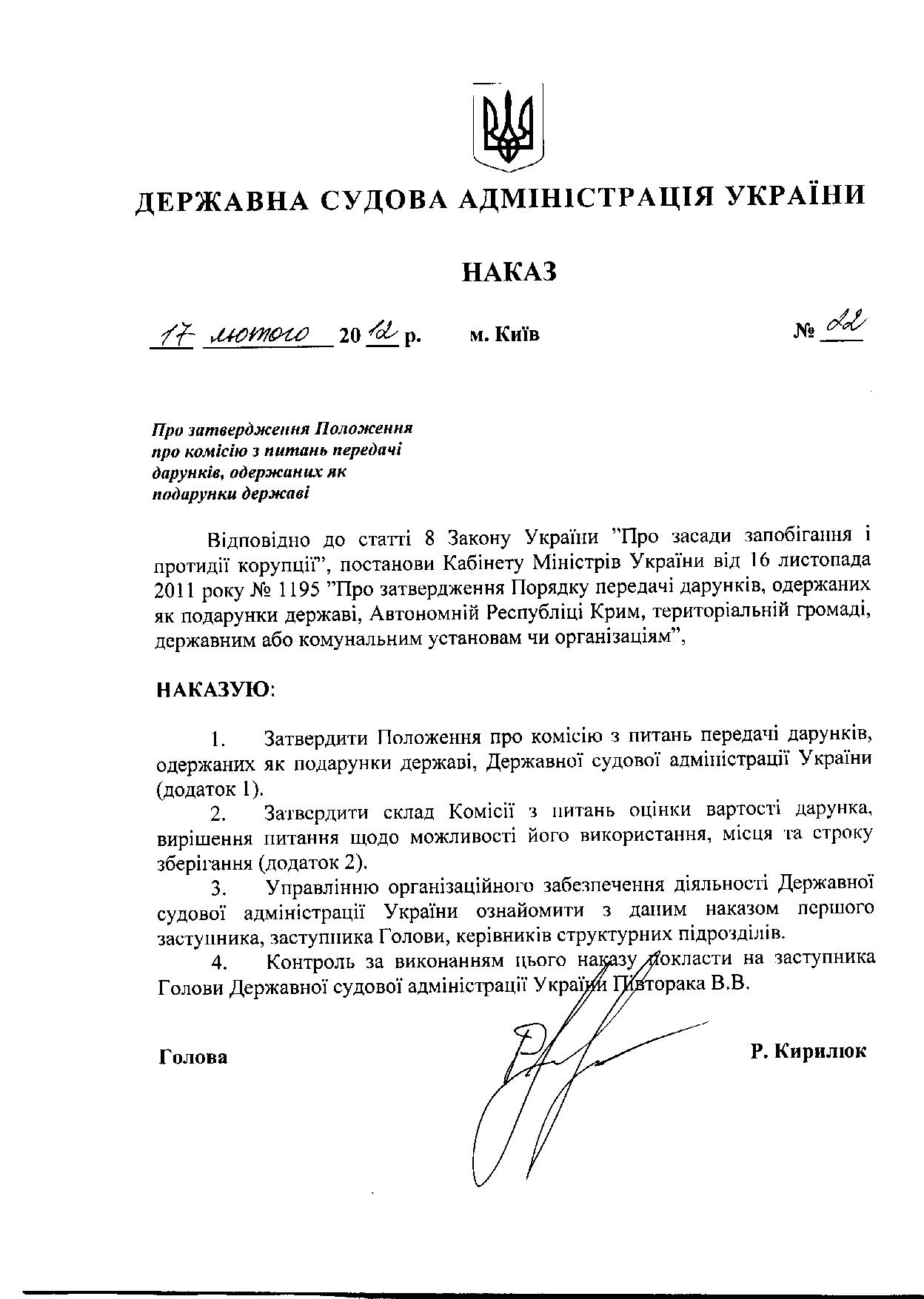 Наказ Державної судової адміністрації України від 17 лютого 2012 року № 22  "Про затвердження Положення про комісію з питань передачі дарунків, одержаних як подарунки державі"