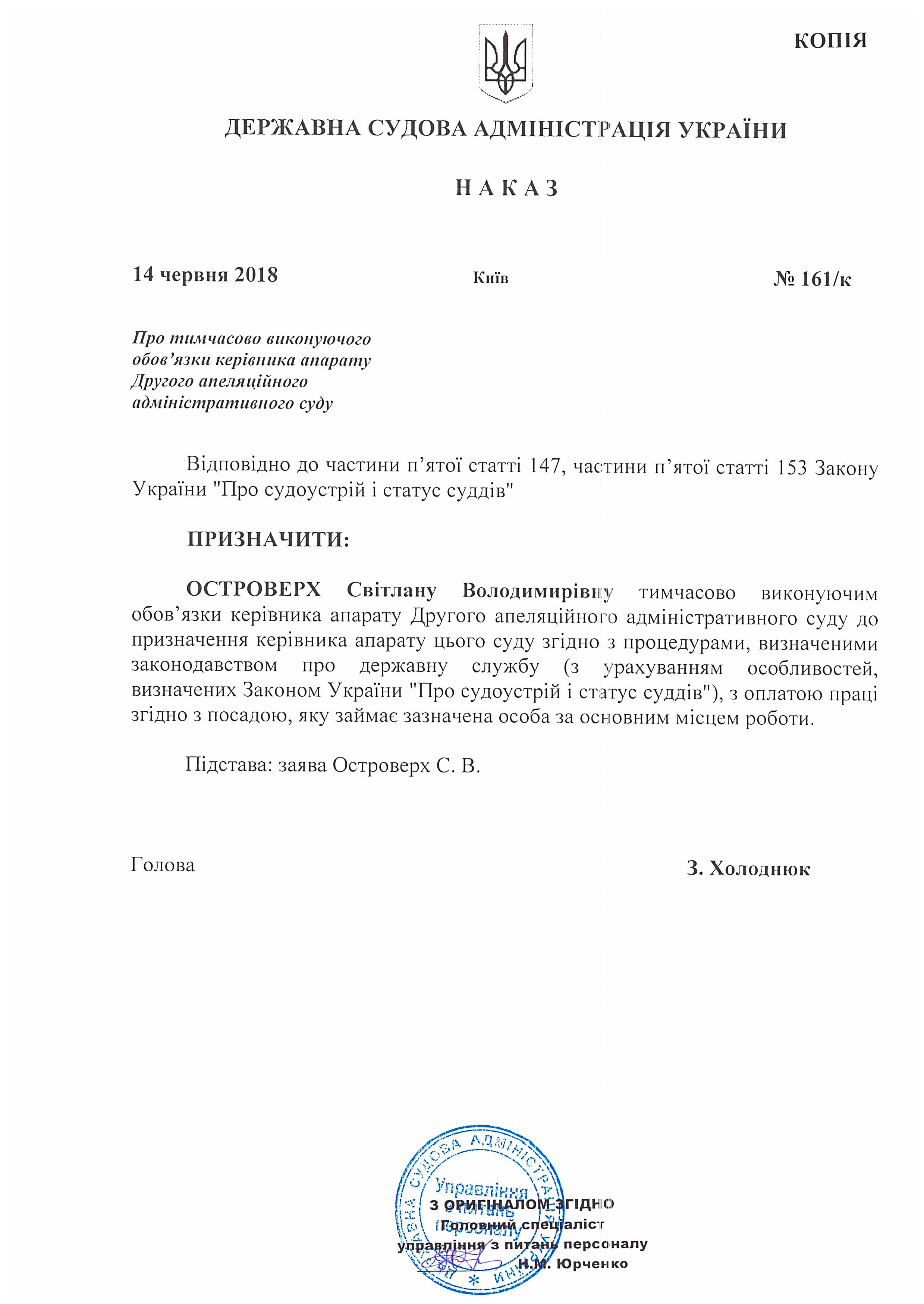 Наказ Державної судової адміністрації України від 14 червня 2018 року №161/к Про тимчасово виконуючого обов'язки керівника апарату Другого апеляційного адміністративного суду