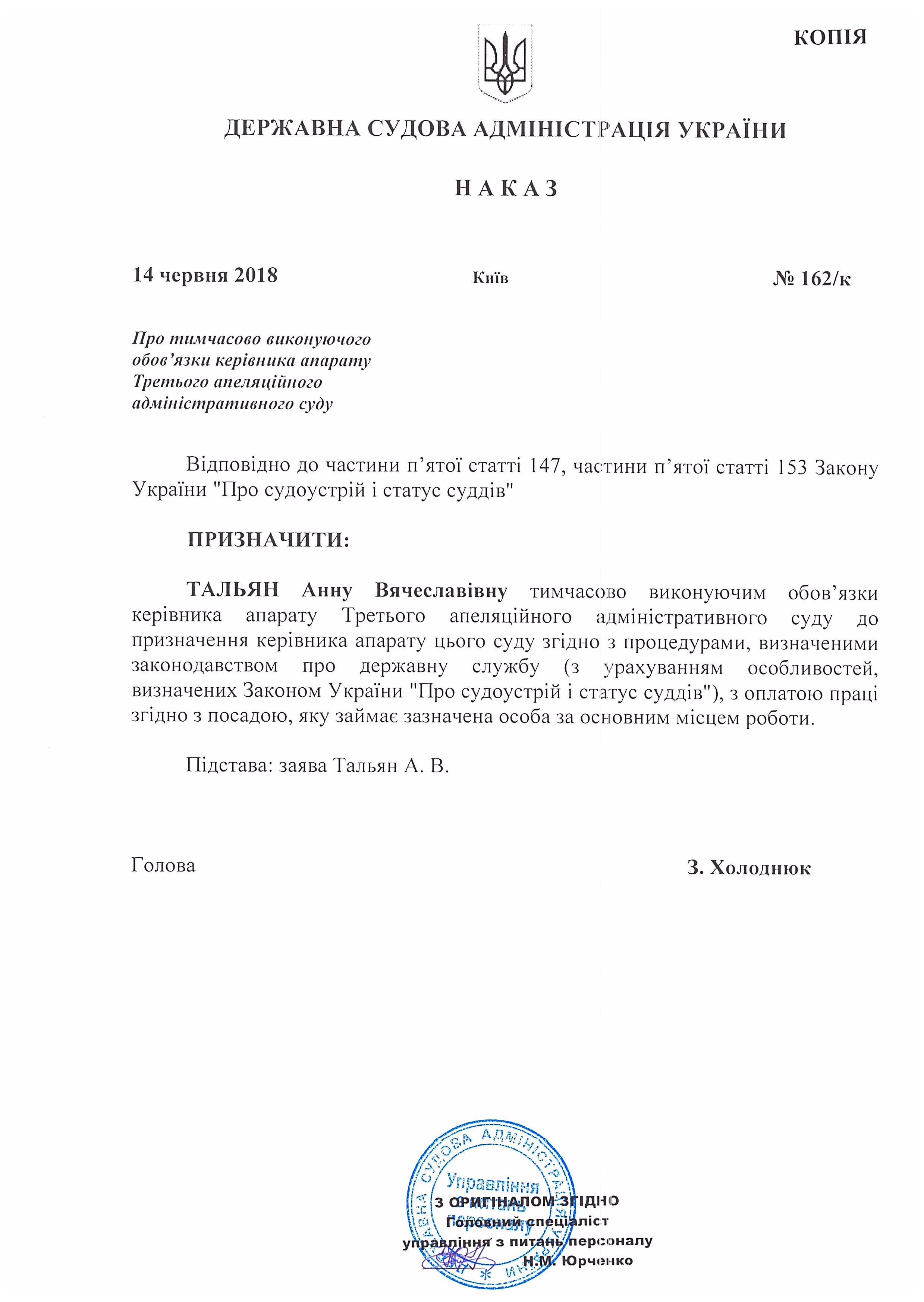Наказ Державної судової адміністрації України від 14 червня 2018 року №162/к Про тимчасово виконуючого обов'язки керівника апарату Третього апеляційного адміністративного суду