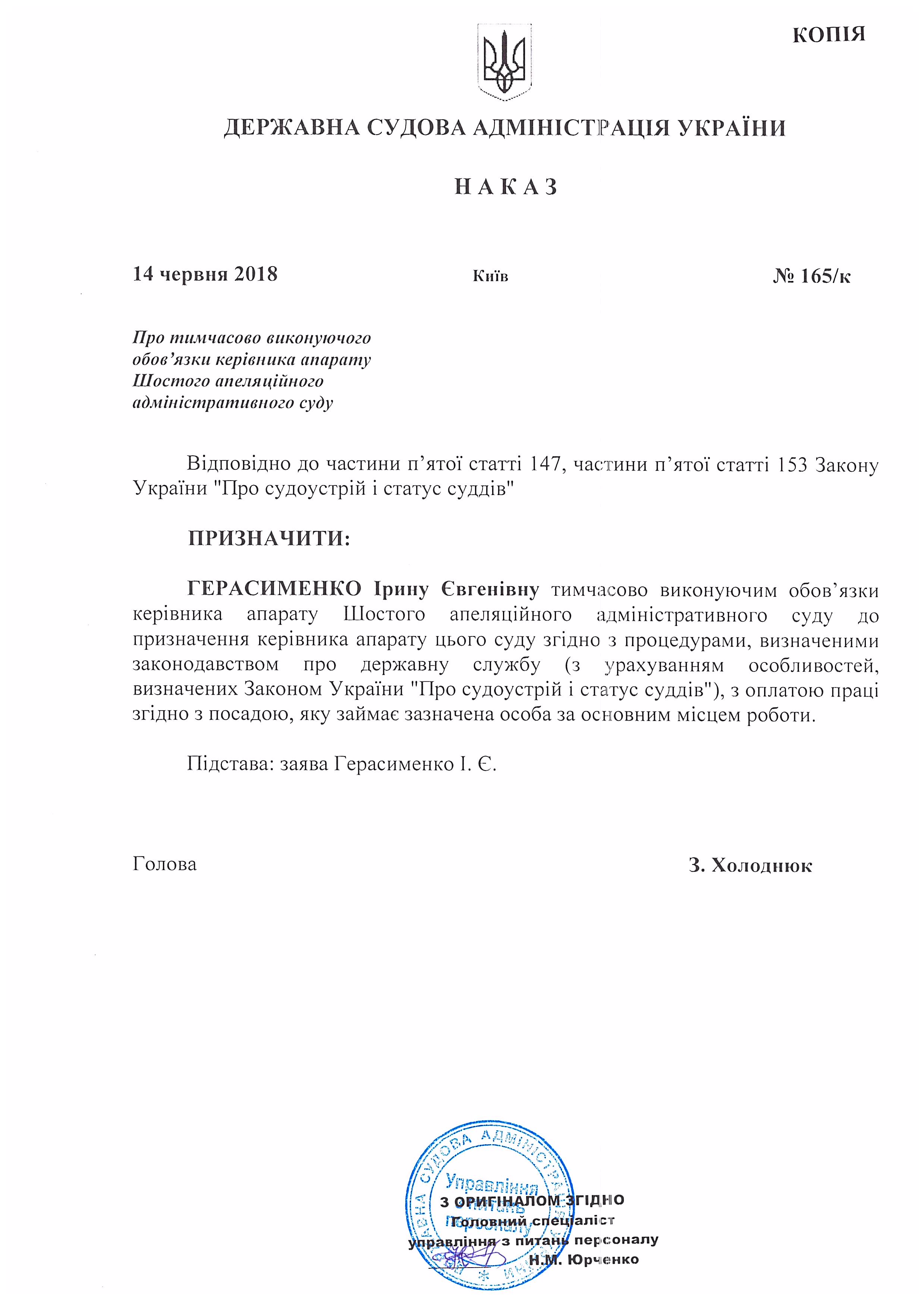 Наказ Державної судової адміністрації України від 14 червня 2018 року №165/к Про тимчасово виконуючого обов'язки керівника апарату Шостого апеляційного адміністративного суду