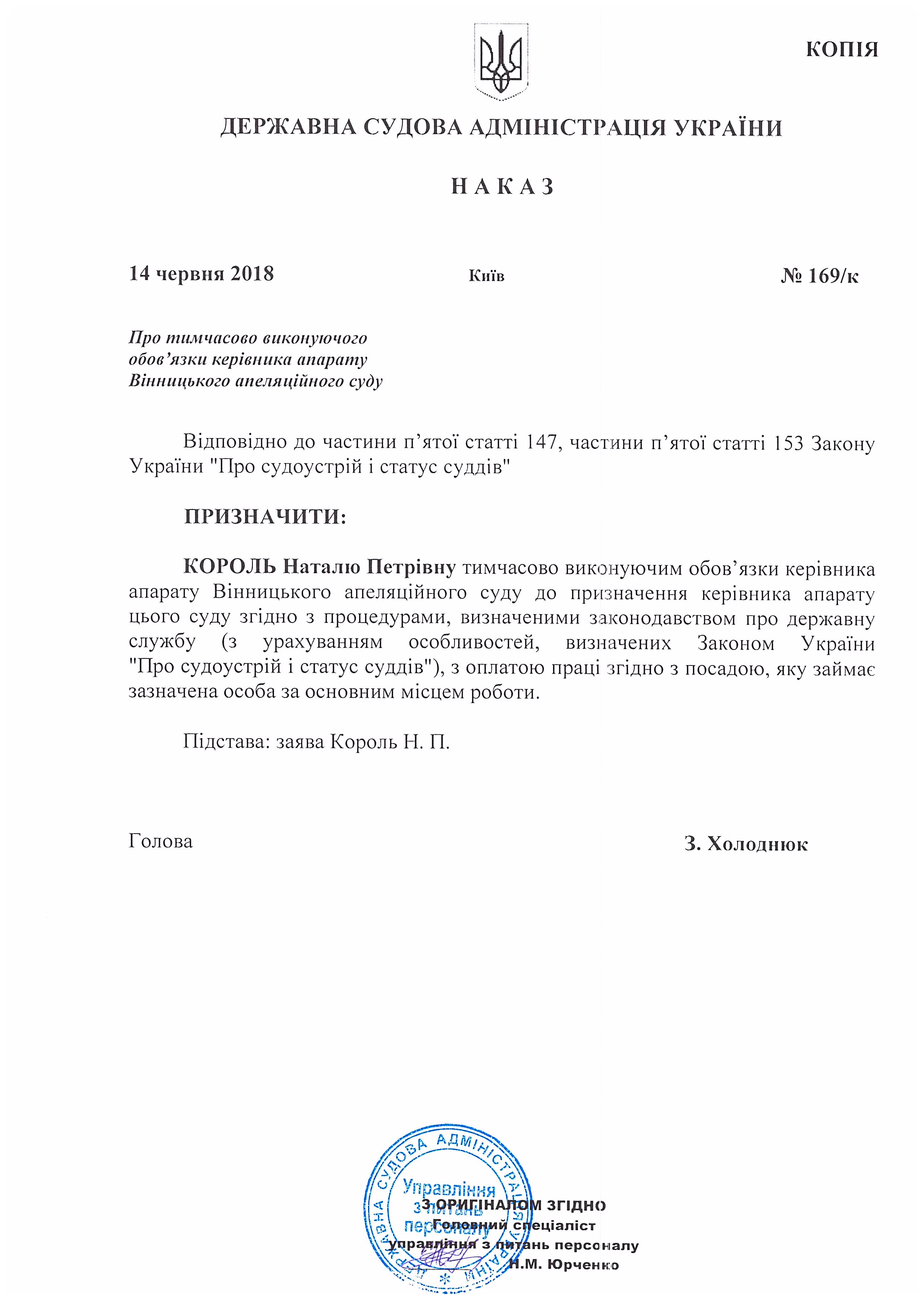 Наказ Державної судової адміністрації України від 14 червня 2018 року №169/к Про тимчасово виконуючого обов'язки керівника апарату Вінницького апеляційного суду