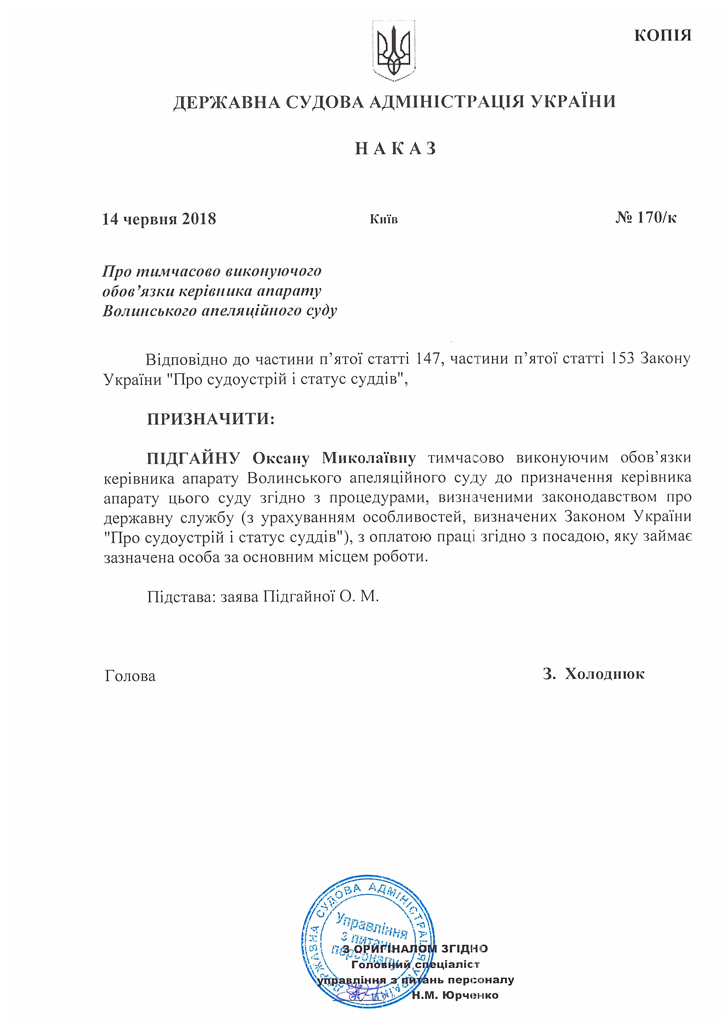 Наказ Державної судової адміністрації України від 14 червня 2018 року №170/к Про тимчасово виконуючого обов'язки керівника апарату Волинського апеляційного суду
