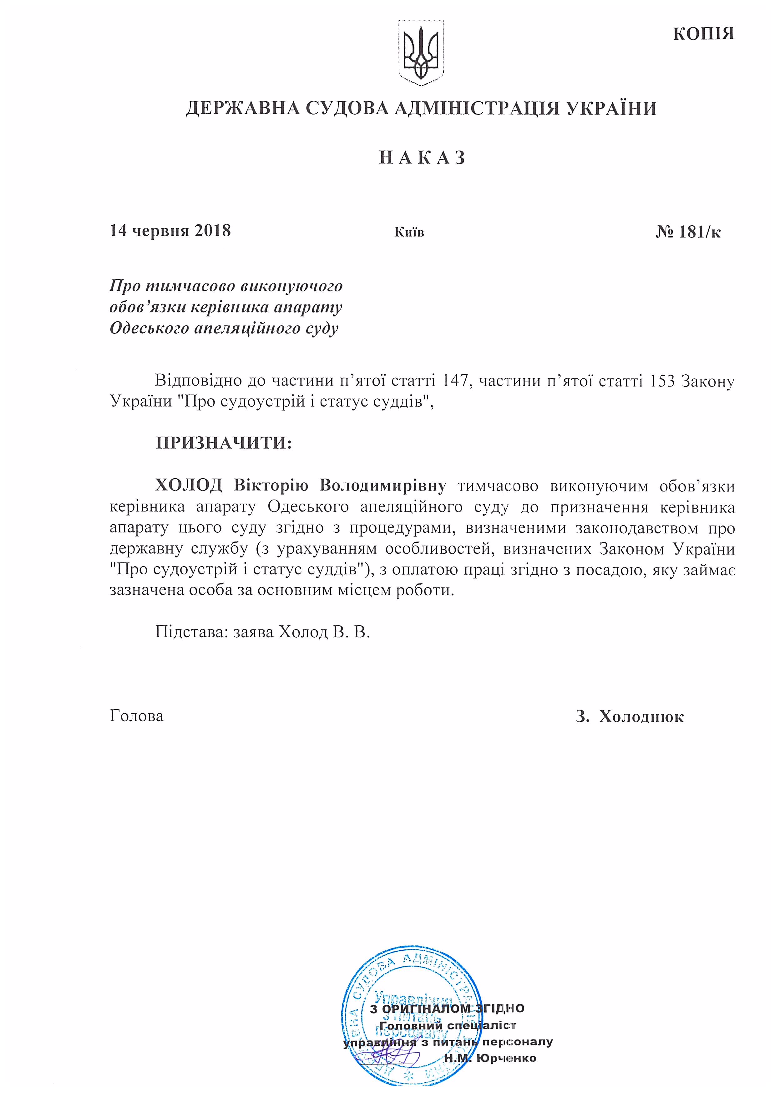 Наказ Державної судової адміністрації України від 14 червня 2018 року №181/к Про тимчасово виконуючого обов'язки керівника апарату Одеського апеляційного суду