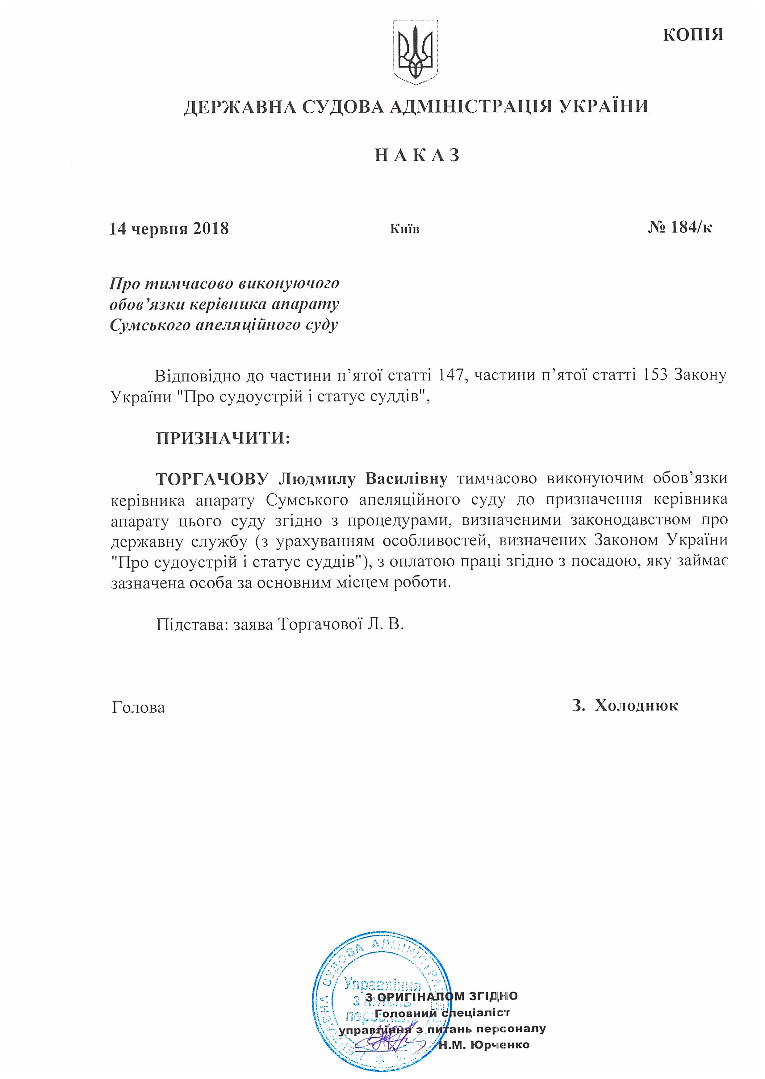 Наказ Державної судової адміністрації України від 14 червня 2018 року №184/к Про тимчасово виконуючого обов'язки керівника апарату Сумського апеляційного суду