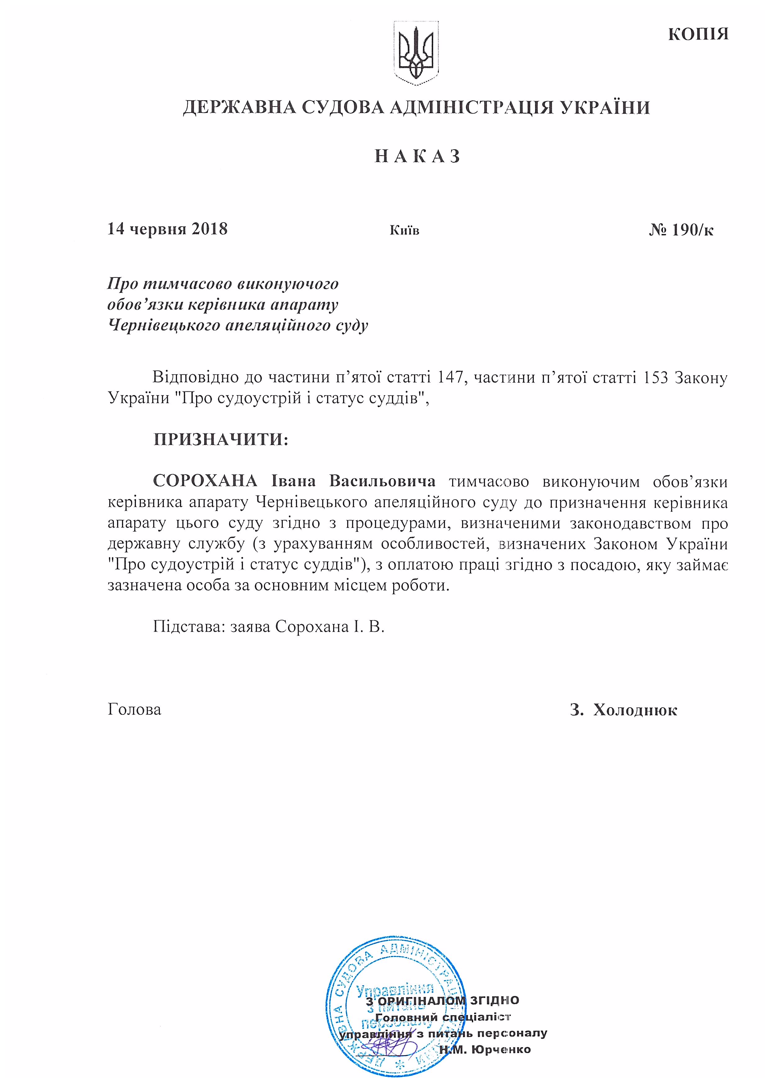 Наказ Державної судової адміністрації України від 14 червня 2018 року №190/к Про тимчасово виконуючого обов'язки керівника апарату Чернівецького апеляційного суду