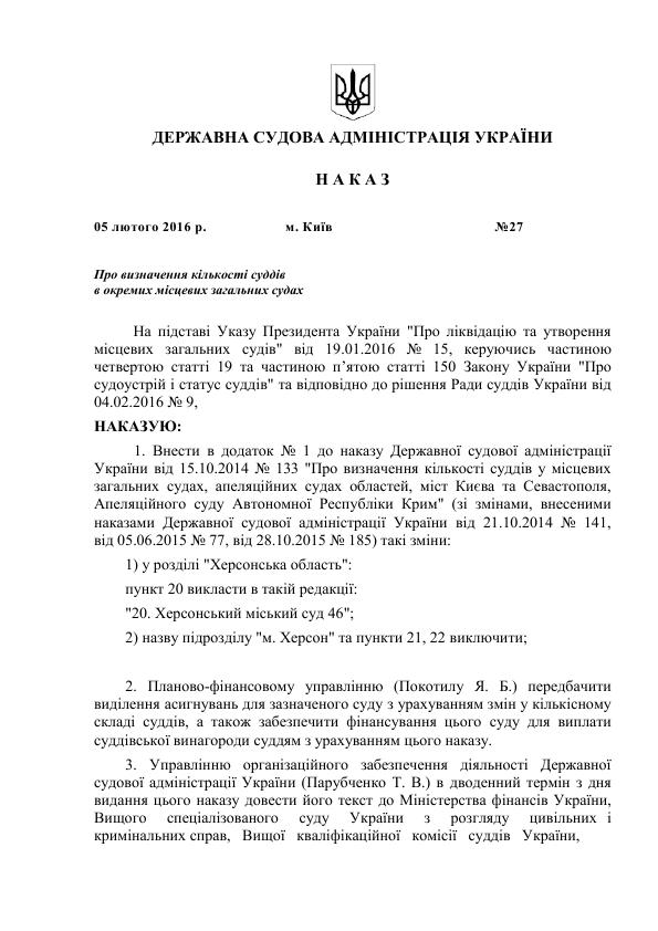 Наказ Державної судової адміністрації України від 05 лютого 2016 року № 27 “Про визначення кількості суддів в окремих місцевих загальних судах ”