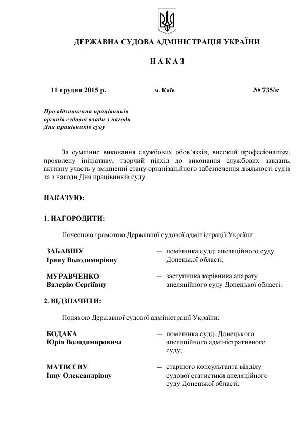 Наказ від 11 грудня 2015 року №735/к “Про відзначення працівників органів судової влади з нагоди Дня працівників суду”