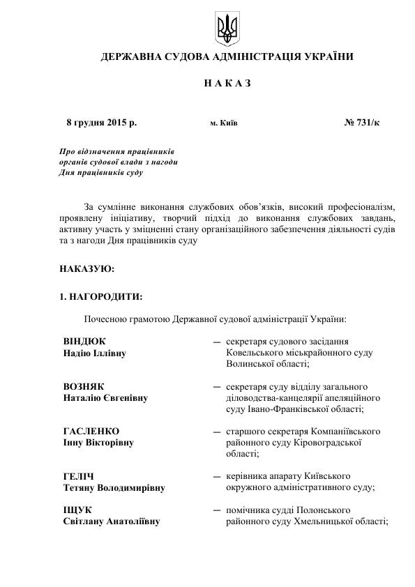 Наказ від 08 грудня 2015 року №731/к “Про відзначення працівників органів судової влади з нагоди Дня працівників суду”