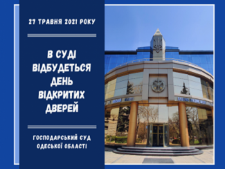 День відкритих дверей буде проведено 27 травня 2021 року в приміщенні Господарського суду Одеської області за адресою: м. Одеса, проспект Шевченка, 29, початок о 15 год. 00 хв.