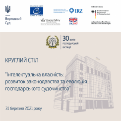 31 березня 2021 року з нагоди 30-річчя створення господарських (арбітражних) судів України відбудеться круглий стіл "Інтелектуальна власність: розвиток законодавства та еволюція господарського судочинства", організований Касаційним господарським судом у складі Верховного Суду у співпраці з проєктом Ради Європи "Підтримка судової влади України в забезпеченні кращого доступу до правосуддя".