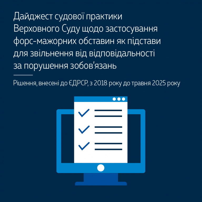 Пропонуємо до вашої уваги дайджест судової практики Верховного Суду щодо застосування форс-мажорних обставин як підстави для звільнення від відповідальності за порушення зобов’язань (рішення, внесені до ЄДРСР, з 2018 року до травня 2025 року) – https://court.gov.ua/storage/portal/supreme/ogliady/Daigest_VS_fors_mazhor.pdf.
