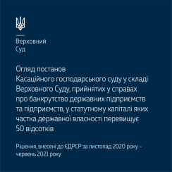 Пропонуємо до вашої уваги огляд постанов Касаційного господарського суду у складі Верховного Суду, прийнятих у справах про банкрутство державних підприємств та підприємств, у статутному капіталі яких частка державної власності перевищує 50 відсотків (за листопад 2020 року – червень 2021 року).