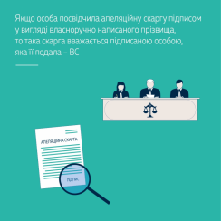 Апеляційний суд констатував, що особа рукописно зазначила своє прізвище при оформленні підпису на копіях апеляційної скарги. У касаційній скарзі вона наполягає, що особисто підписала зазначені копії апеляційної скарги шляхом зазначення свого прізвища. Такий нанесений особою підпис надавав апеляційному суду змогу ідентифікувати особу, яка подала копії документів, та встановити відповідність змісту документа волевиявленню особи, від імені якої їх було подано.