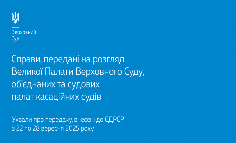 Цього тижня знайомимо вас зі справами, переданими на розгляд Великої Палати Верховного Суду, об’єднаної та судових палат касаційних судів відповідно до ухвал про передачу, внесених до ЄДРСР з 22 по 28 вересня 2025 року.