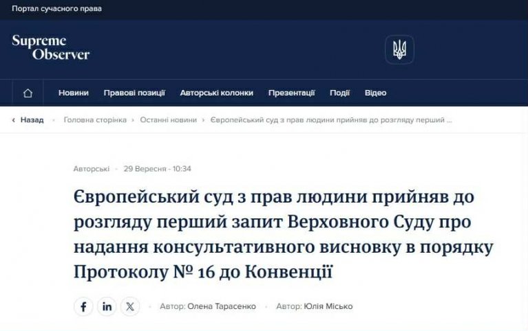 Посилання на статтю, розміщену на порталі Supreme Observer, – https://so.supreme.court.gov.ua/authors/1597/yevropeiskyi-sud-z-prav-liudyny-pryiniav-do-rozhliadu-pershyi-zapyt-verkhovnoho-sudu-pro-nadannia-konsultatyvnoho-vysnovku-v-poriadku-protokolu-%E2%84%96-16-do-konventsii-