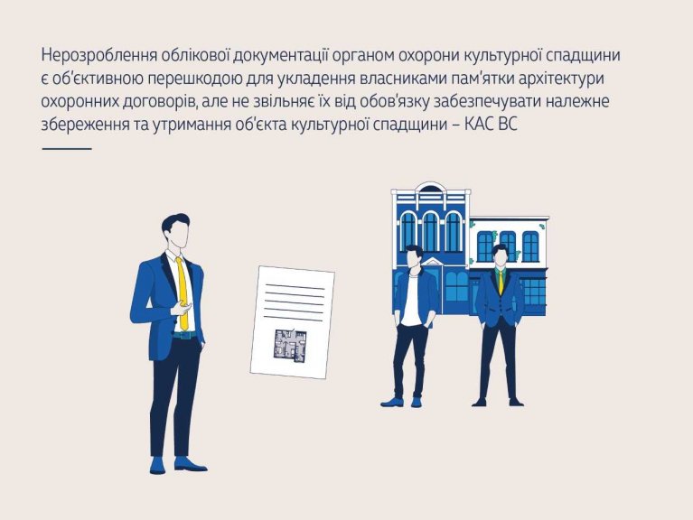 Нерозроблення облікової документації органом охорони культурної спадщини є об’єктивною перешкодою для укладення власниками пам’ятки архітектури охоронних договорів, але не звільняє їх від обов’язку забезпечувати належне збереження та утримання об’єкта культурної спадщини – КАС ВС.