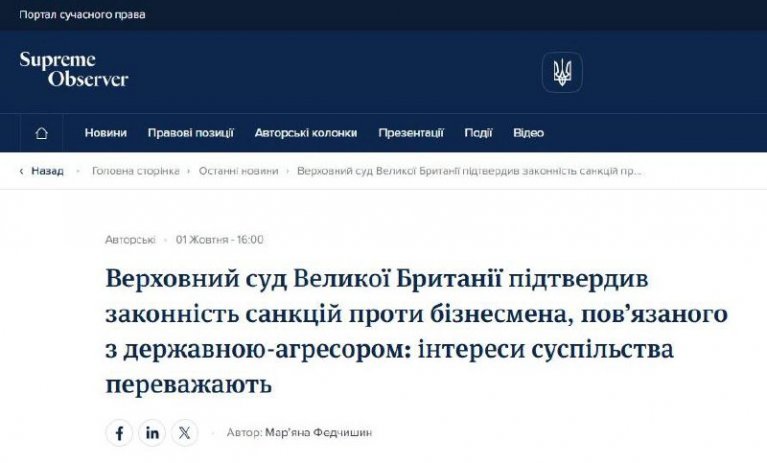 Читайте огляд рішення на порталі Supreme Observer за посиланням: https://so.supreme.court.gov.ua/authors/1608/verkhovnyi-sud-velykoi-brytanii-pidtverdyv-zakonnist-sanktsii-proty-biznesmena-poviazanoho-z-derzhavnoiuahresorom-interesy-suspilstva-perevazhaiut