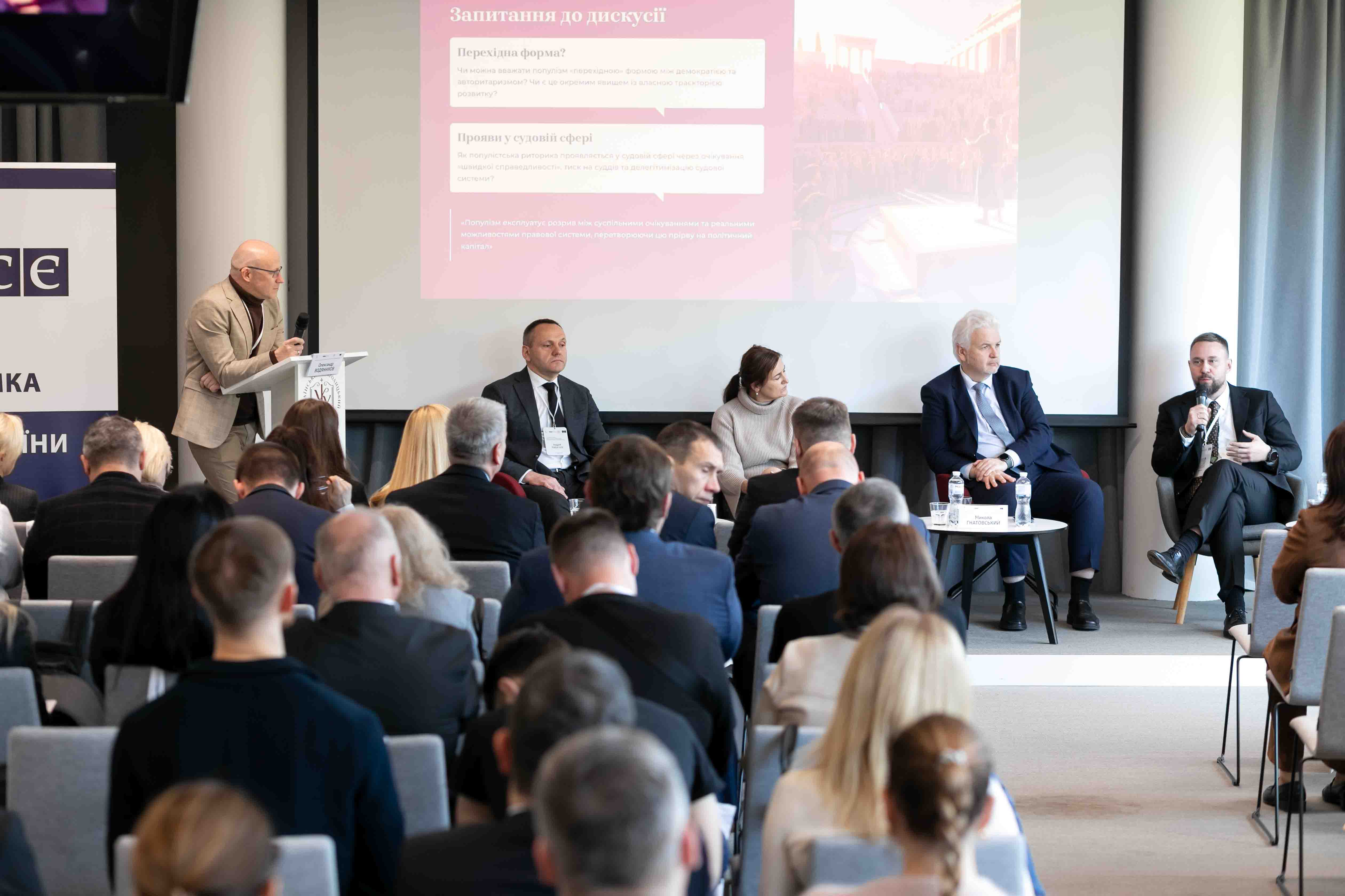 У межах шостої сесії «Популізм як загроза верховенству права: судовий вимір», яку модерував суддя Конституційного Суду України Олександр Водянніков, учасники підсумували два дні розмов про виклики для демократії й судової влади, зосередившись на найуразливішому питанні впливу популізму на правосуддя. Відкриваючи дискусію, модератор окреслив її логіку: від медіа й нетрадиційних джерел інформації до глобального феномену популізму, що, на відміну від відвертого авторитаризму, діє зсередини демократичних інститутів, експлуатуючи емоції, очікування простих рішень.