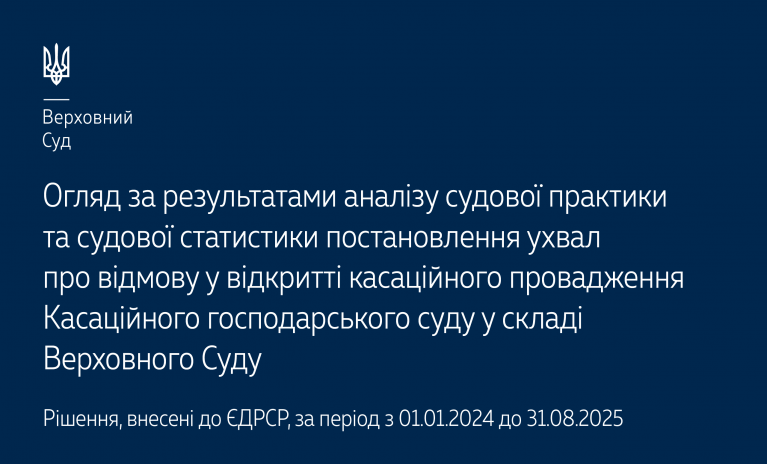 Пропонуємо до вашої уваги огляд за результатами аналізу судової практики та судової статистики постановлення ухвал про відмову у відкритті касаційного провадження Касаційного господарського суду у складі Верховного Суду – https://court.gov.ua/storage/portal/supreme/ogliady/Oglyad_KGS_Analiz_vidmov_2024_2025.pdf