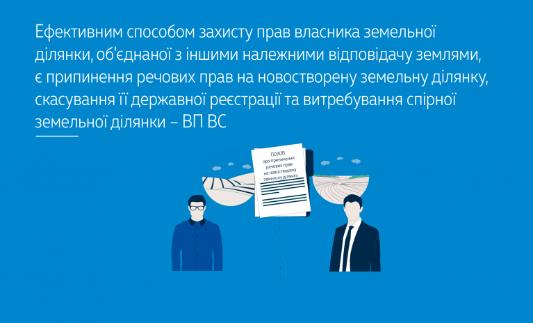 Перед Великою Палатою ВС постало питання щодо визначення ефективного способу захисту прав власника земельної ділянки, яка була об’єднана з іншими земельними ділянками, внаслідок чого сформована нова земельна ділянка, яка включає як земельні ділянки, що належать позивачу, так і земельні ділянки, що належать відповідачу.