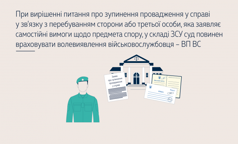 Розглянувши справу, Велика Палата ВС зазначила, що суд зобов'язаний зупинити провадження у справі у разі перебування сторони або третьої особи, яка заявляє самостійні вимоги щодо предмета спору, у складі ЗСУ або інших утворених відповідно до закону військових формувань, що переведені на воєнний стан або залучені до проведення антитерористичної операції (п. 2 ч. 1 ст. 251 ЦПК України).