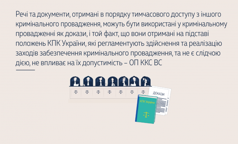 ОП ККС дійшла висновку, що надійність джерела походження та доказів, отриманих за допомогою тимчасового доступу до речей і документів з іншого провадження, є не меншою, аніж надійність доказів, отриманих у результаті слідчих (розшукових) дій.