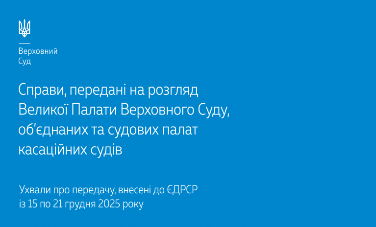 Цього тижня знайомимо вас зі справами, переданими на розгляд Великої Палати Верховного Суду, об’єднаних та судових палат касаційних судів відповідно до ухвал про передачу, внесених до ЄДРСР із 15 по 21 грудня 2025 року.