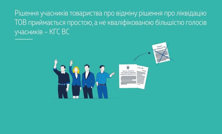 Касаційний суд зазначив, що рішення про відміну рішення про припинення товариства належить до переліку рішень, обумовлених у п. 14 ч. 2 ст. 30 Закону «Про товариства з обмеженою та додатковою відповідальністю» (в редакції, чинній станом на день прийняття оскаржуваного рішення загальних зборів), зокрема до інших рішень, віднесених законом до компетенції загальних зборів учасників, тому таке рішення приймається більшістю голосів усіх учасників товариства, які мають право голосу з відповідних питань.