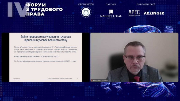 Владислав Шипович поінформував учасників форуму про зміни правового регулювання трудових відносин під час дії воєнного стану, проаналізував окремі положення КЗпП України та Закону України «Про організацію трудових відносин в умовах воєнного стану» і висловив думку, що під час війни зміни у трудовому законодавстві обумовлені переважно реагуванням держави на умови, в яких опинилися роботодавці та працівники, і на пошук справедливого балансу між законними інтересами сторін цих правовідносин.