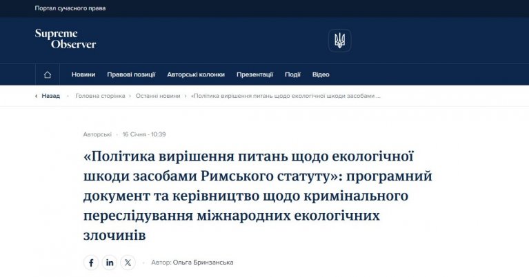 У статті начальника управління аналітичної та правової роботи Касаційного кримінального суду департаменту аналітичної та правової роботи Верховного Суду Ольги Бринзанської проаналізовано зміст оприлюдненої МКС Політики вирішення питань щодо екологічної шкоди засобами Римського статуту, її ключові положення, термінологічні підходи та потенційний вплив на міжнародну й національну правозастосовну практику.
