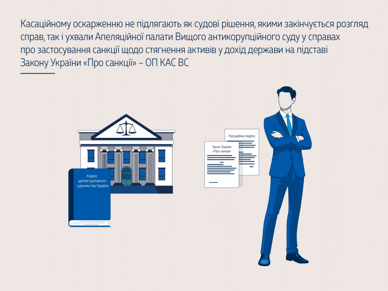 Не підлягають касаційному оскарженню судові рішення Вищого антикорупційного суду (рішення та ухвали), ухвалені (постановлені) у справах про застосування санкції щодо стягнення активів у дохід держави відповідно до п. 1-1 ч. 1 ст. 4 Закону України «Про санкції», особливості розгляду яких визначені ст. 283-1 КАС України, а також ухвали та постанови Апеляційної палати Вищого антикорупційного суду у цих справах.