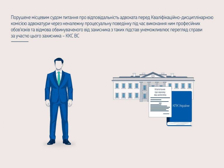 Порушене місцевим судом питання про відповідальність адвоката перед Кваліфікаційно-дисциплінарною комісією адвокатури через неналежну процесуальну поведінку під час виконання ним професійних обов’язків та відмова обвинуваченого від захисника з таких підстав унеможливлює перегляд справи за участю цього захисника – ККС ВС.