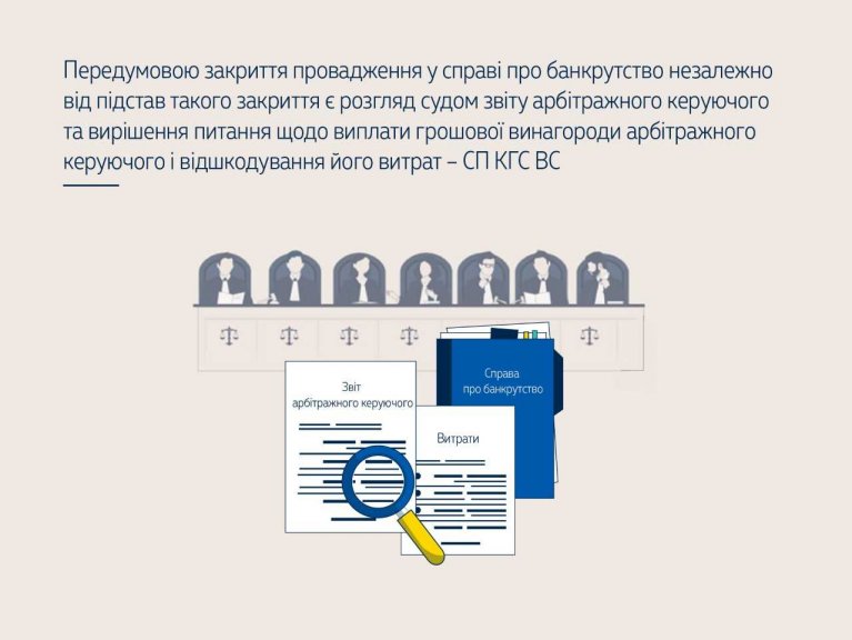 Передумовою закриття провадження у справі про банкрутство незалежно від підстав такого закриття є розгляд судом звіту арбітражного керуючого та вирішення питання щодо виплати грошової винагороди арбітражного керуючого і відшкодування його витрат – СП КГС