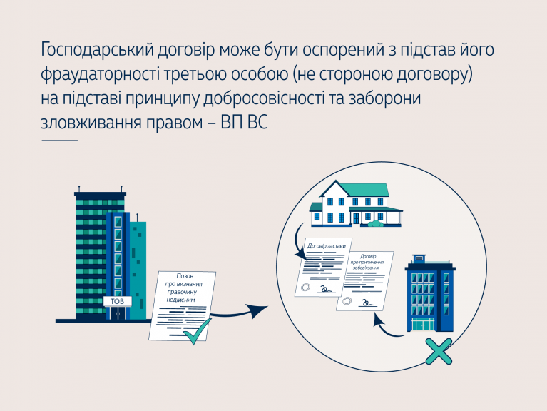 З огляду на наведене Велика Палата ВС зазначила, що оспорити фраудаторний правочин може заінтересована особа, яка не була його стороною. У разі звернення з таким позовом третьої особи (не сторони договору) з метою захисту її прав та інтересів як кредитора в іншому зобов’язанні вимога про визнання недійсним фраудаторного правочину є правомірним та ефективним способом захисту, оскільки кредитор зазвичай зацікавлений у поверненні йому грошових коштів, а не майна, яке надалі буде потрібно відчужувати задля отримання цих коштів.