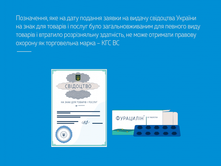 Касаційний суд дійшов висновку, що суди попередніх інстанцій правильно застосували норми законодавства у сфері охорони прав на знаки для товарів і послуг та обґрунтовано встановили, що на дату подання заявки позначення «Фурацилін» було загальновживаним і не мало розрізняльної здатності.