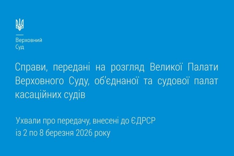 Цього тижня знайомимо вас зі справами, переданими на розгляд Великої Палати Верховного Суду, об’єднаної та судової палат касаційних судів, відповідно до ухвал про передачу, внесених до ЄДРСР із 2 по 8 березня 2026 року.