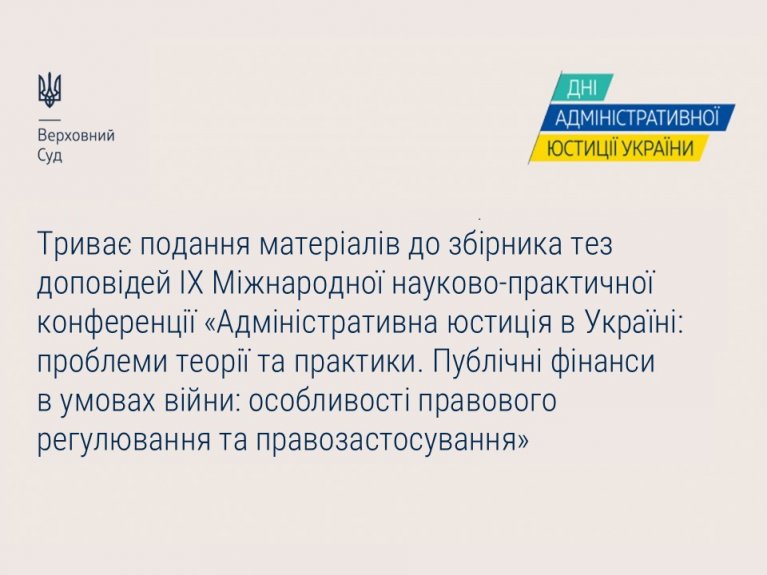 Нагадуємо, що до початку роботи ІХ Міжнародної науково-практичної конференції «Адміністративна юстиція в Україні: проблеми теорії та практики. Публічні фінанси в умовах війни: особливості правового регулювання та правозастосування», яку 2–3 липня 2026 року організовує Касаційний адміністративний суд у складі Верховного Суду, заплановано видання збірника тез доповідей. Для забезпечення його своєчасного формування тези доповідей можна подати до 15 квітня 2026 року.