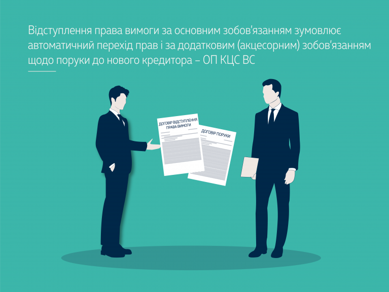 ОП КЦС ВС зазначила, що з моменту переходу до нового кредитора права вимоги за основним зобов’язанням, порука за яким не припинилася, право вимоги до поручителя вважається таким, що одночасно перейшло до нового кредитора, якщо інше не передбачено договором відступлення права вимоги.