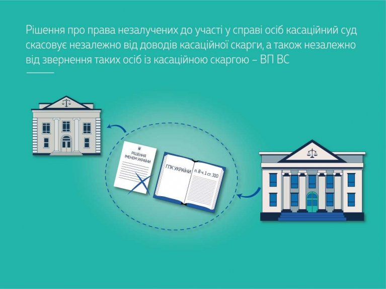 Повноваження скасувати судове рішення з направленням справи на новий розгляд, якщо суд нижчої інстанції прийняв рішення про права, інтереси та (або) обов’язки осіб, що не були залучені до участі у справі (п. 8 ч. 1 ст. 310 ГПК України), суд касаційної інстанції здійснює незалежно від вимог і доводів касаційної скарги, а також незалежно від того, чи звернулися з касаційною скаргою особи, про права, інтереси та (або) обов’язки яких суд нижчої інстанції ухвалив рішення.