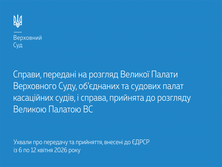 Цього тижня знайомимо вас зі справами, переданими на розгляд Великої Палати Верховного Суду, об’єднаних та судових палат касаційних судів, а також зі справою, прийнятою до розгляду Великою Палатою ВС, відповідно до ухвал про передачу та прийняття, внесених до ЄДРСР із 6 по 12 квітня 2026 року.