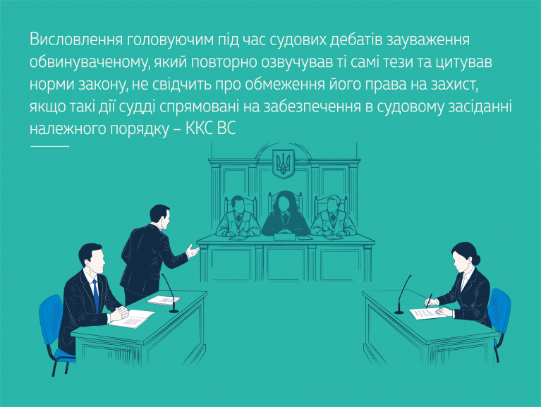 Колегія суддів ККС ВС дійшла висновку, що висловлення головуючою обвинуваченому під час судових дебатів зауваження не свідчить про будь-які обмеження його прав, оскільки такі дії головуючої були спрямовані виключно на виконання приписів ч. 1 ст. 321 КПК України, за якими головуючий у судовому засіданні керує ходом судового засідання, забезпечує додержання послідовності та порядку вчинення процесуальних дій, здійснення учасниками кримінального провадження їхніх процесуальних прав і виконання ними обов’язків, спрямовує судовий розгляд на забезпечення з’ясування всіх обставин кримінального провадження, усуваючи із судового розгляду все, що не має значення для кримінального провадження. Забезпечення порядку проведення судових дебатів у такий спосіб жодним чином не вплинуло на реалізацію обвинуваченим права на захист.