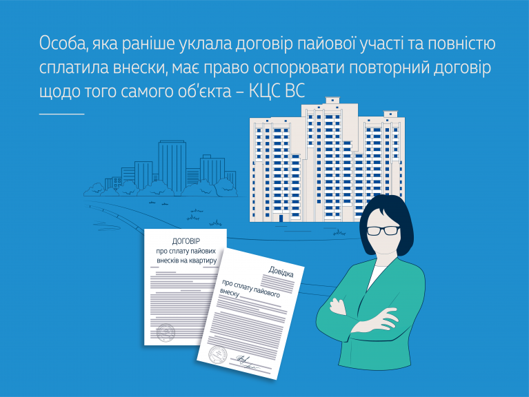 У справі, що переглядалася, встановлено, що позивачка уклала з обслуговуючим кооперативом договір про сплату пайових внесків на квартиру та повністю оплатила її вартість. Проте згодом кооператив, не розриваючи цього договору з першим інвестором, уклав аналогічний договір щодо цієї самої квартири з відповідачем.