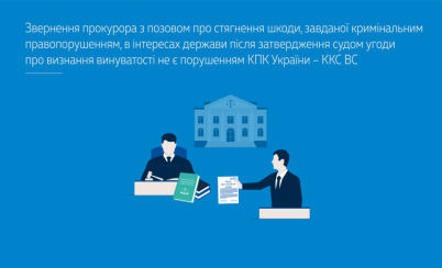 Колегія суддів ККС ВС вказала, що подальше звернення прокурора з позовом про стягнення шкоди, завданої кримінальним правопорушенням, в інтересах держави після затвердження судом угоди про визнання винуватості не є порушенням КПК України, оскільки визначені в КПК України умови угоди про визнання винуватості не обмежують стягнення шкоди на підставах, визначених відповідними нормами ЦК України, зокрема ст. 1166 ЦК України. Звернення прокурора з позовом після затвердження судом угоди про визнання винуватості в розумінні ч. 4 ст. 474 КПК України не є наслідком її укладення та затвердження, а є реалізацією прокурором своїх повноважень в інтересах держави в порядку певного судочинства, яке гарантоване чинним законодавством.