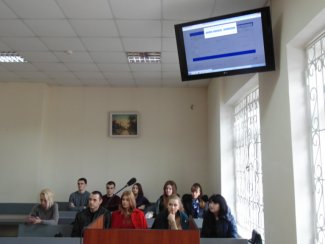 Алла Шевченко розповіла студентам про можливість проведення судових засідань у режимі відеоконференції та можливість відправки учасникам процесу процесуальних документів та судових повісток в електронному вигляді в рамках проекту «Електронний суд». Також звернула увагу студентів на можливість оплати судового збору в он-лайн режимі та можливість перегляду звіту про автоматизований розподіл справи. Наочно продемонструвала як розрахувати суму судового збору та сформувати відповідну квитанцію. А також Алла Шевченко показала як самостійно відстежити рух будь-якої справи на веб – сайті Зарічного районного суду м. Суми.