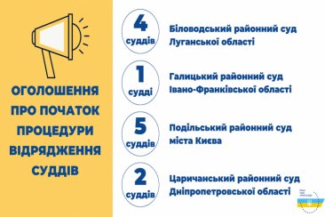 Вища рада правосуддя відповідно до рішень від 1 грудня 2020 року № 3326/0/15-20№ 3328/0/15-20№ 3329/0/15-20№ 3330/0/15-20 оголошує про початок процедури відрядження суддів до іншого суду того самого рівня і спеціалізації для здійснення правосуддя, а саме до: