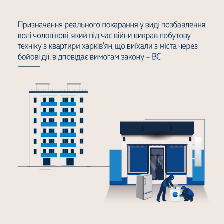 Верховний Суд залишив без змін вирок апеляційного суду щодо харків’янина, який влітку 2022 року, скориставшись відсутністю власників майна, що виїхали з Харкова через ведення бойових дій на території міста та завдання авіаудару рф, вчинив крадіжку побутової техніки (ч. 4 ст. 185 КК України).