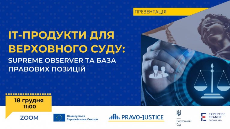 Проєкт ЄС "Право-Justice" запрошує на презентацію реалізованих IT-продуктів для Верховного Суду, а саме онлайн-порталу Supreme Observer та оновленої Бази правових позицій.