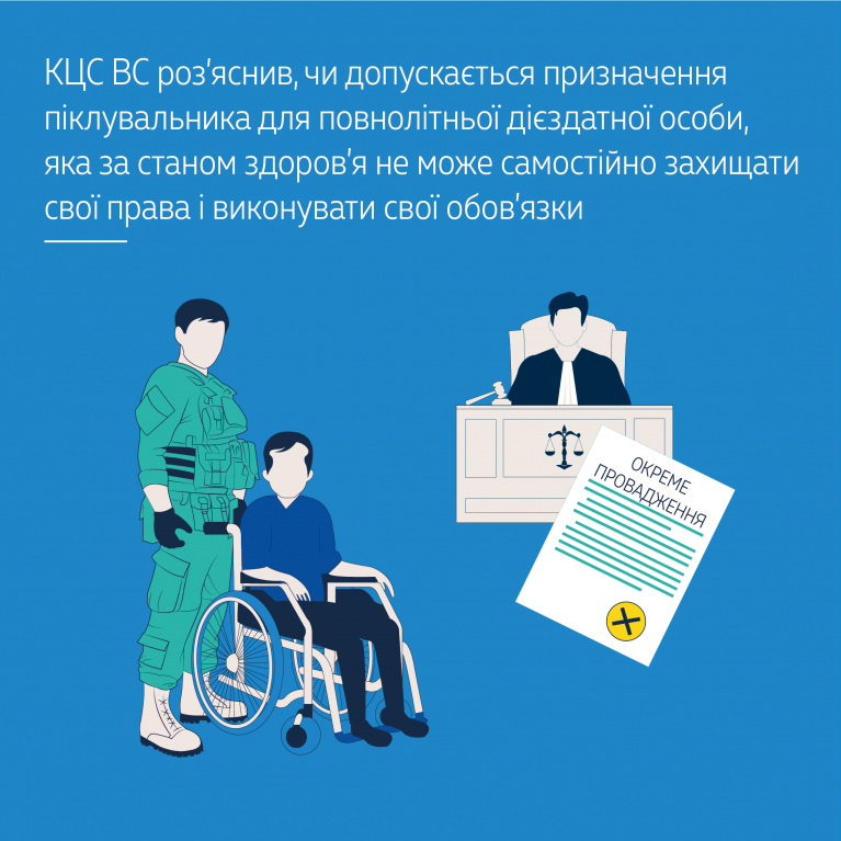 ЦПК України передбачає випадок, за якого цивільний суд у порядку окремого провадження може призначити піклувальника: при обмеженні цивільної дієздатності фізичної особи (глава 2 розд. ІV ЦПК України). Інших випадків, за яких цивільний суд може призначити піклувальника для фізичної особи в порядку окремого провадження, ЦПК України не містить. Тому фраза «заява не підлягає розгляду в порядку цивільного судочинства» означає й те, що заява про встановлення піклування та призначення піклувальника для повнолітньої дієздатної особи, яка за станом здоров’я не може самостійно захищати свої права і виконувати свої обов’язки, не підлягає розгляду в порядку окремого провадження.