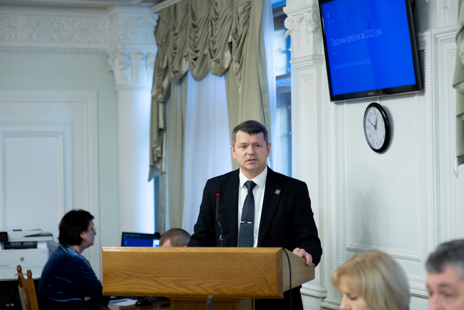 З доповіддю про результати роботи ККС ВС виступив заступник керівника Апарату – керівник секретаріату Касаційного кримінального суду у складі Верховного Суду Юрій Хім’як. Перш за все він поінформував про зміни до штатного розпису суду, що відбулися у 2023 році, внаслідок яких було скорочено кількість працівників Апарату на 22 % та надалі видано розпорядження про затвердження алгоритмів взаємодії між підрозділами для забезпечення належної діяльності установи. Окрему увагу він звернув на збільшення кількості електронної документації, яка ведеться в суді (у тому числі й вихідної). Це вже дає можливість скоротити поштові витрати і пришвидшити процеси комунікації, проте планується подальша робота щодо цього. Юрій Хім’як висловив сподівання, що найближчим часом будуть вирішені всі питання електронного документообігу як на технічному, так і на законодавчому рівнях.